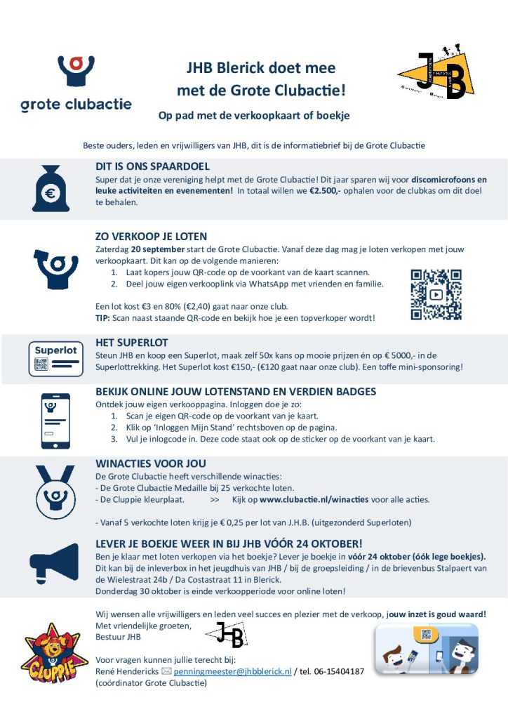 Wij zijn gestart met de Grote Clubactie en gaan we met z’n allen zoveel mogelijk loten verkopen voor JHB. De leden hebben een mail ontvangen hierover met een link om ook online loten te verkopen, daarnaast kunnen loten ook nog verkocht worden via inschrijving in het boekje. Succes met verkopen, laten we er een succes van maken met z’n allen!